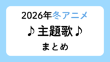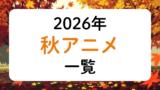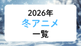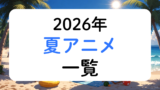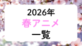 トップページ 2025.12.222026.02.27 2026年アニメ一覧 2026年冬アニメ一覧2026年の冬クールに放送が始まるアニメ作品をまとめました。作品名の五十音順で並んでいます。悪魔くん公式サイト公式X放送情報スタッフ総監督:佐藤順一キャラクター原案・シリーズディレクター:追崎史敏シリーズ構成:大野木寛キャラクターデザイン・... 2026年春アニメ一覧2026年の春クールに放送が始まるアニメ作品をまとめました。作品名の五十音順で並んでいます。愛してるゲームを終わらせたい公式サイト公式X放送情報スタッフ原作:堂本裕貴(⼩学館「サンデーうぇぶり」連載中)監督:谷 東シリーズ構成・脚本:大知慶... 2026年夏アニメ一覧2026年の夏クールに放送が始まるアニメ作品をまとめました。作品名の五十音順で掲載しています。アズールレーン びそくぜんしんっ!にっ!!公式サイト公式X放送情報スタッフ漫画:ホリ(月刊コミックREX/一迅社刊)原作:『アズールレーン』運営監... 2026年秋アニメ一覧2026年の秋クールに放送が始まるアニメ作品をまとめました。作品名の五十音順で並んでいます。『アオのハコ』第2期公式サイト公式X放送情報スタッフ音楽OP:ED:放送開始日2026年秋配信開始日恐怖コレクター公式サイト公式X放送情報スタッフ音... 2026年劇場アニメ一覧 2026年公開予定劇場アニメ作品一覧2026年に公開が予定されている劇場アニメ作品をまとめました。公開日順で並んでいます。公開日が決まっていない作品はその下から五十音順で並んでいます。公開後2週間程経った作品は削除します。超かぐや姫!公式サイト公式X劇場情報スタッフ監督:山下... 時期未定作品 放送クール未定アニメ一覧放送クールが決まっていないアニメ作品をまとめました。放送年が決まっていてもクールが決まってない作品もこちらに掲載しています。作品名の五十音順で並んでいます。暁のヨナ公式サイト公式X放送情報あはれ!名作くん公式サイト公式X放送情報『一瞬で治療... 公開時期未定劇場アニメ作品一覧公開時期が決まっていない劇場アニメ作品をまとめました。五十音順で並んでいます。アイゼンフリューゲル公式サイト公式Xスタッフ原作:虚淵玄(ニトロプラス)「アイゼンフリューゲル」(小学館「ガガガ文庫」刊)総監督:水島精二監督:小松田大全キャラク... アニメ主題歌まとめ 2026年冬アニメ主題歌まとめ2026年の冬アニメ主題歌をまとめました。有栖川煉ってホントは女なんだよね。ED「僕とのひめゴト」歌:sammy作詞:直兎馬亭記草作曲・編曲:MIDARE悪役令嬢は隣国の王太子に溺愛されるOP「愛のファンファーレ」歌:高垣彩陽 feat. ...